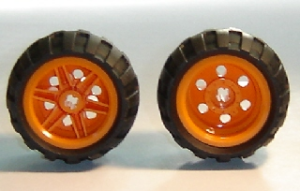 122c01assy3 – Plate, Modified 2 x 2 with Red Wheels with Black Tires 21mm D. x 9mm Offset Tread Medium (122c01/ 4084)